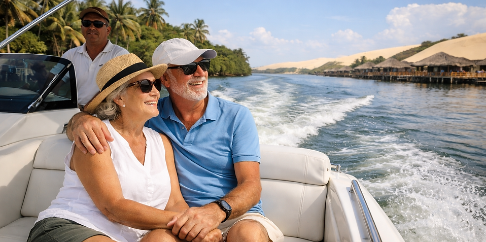 Pessoas idosas são muito bem-vindas no passeio da CLAIRANE LANCHAS. Nossas embarcações oferecem navegação confortável, estável e sem aperto, bem diferente das lanchas rápidas tradicionais, o que torna a experiência mais tranquila e segura.